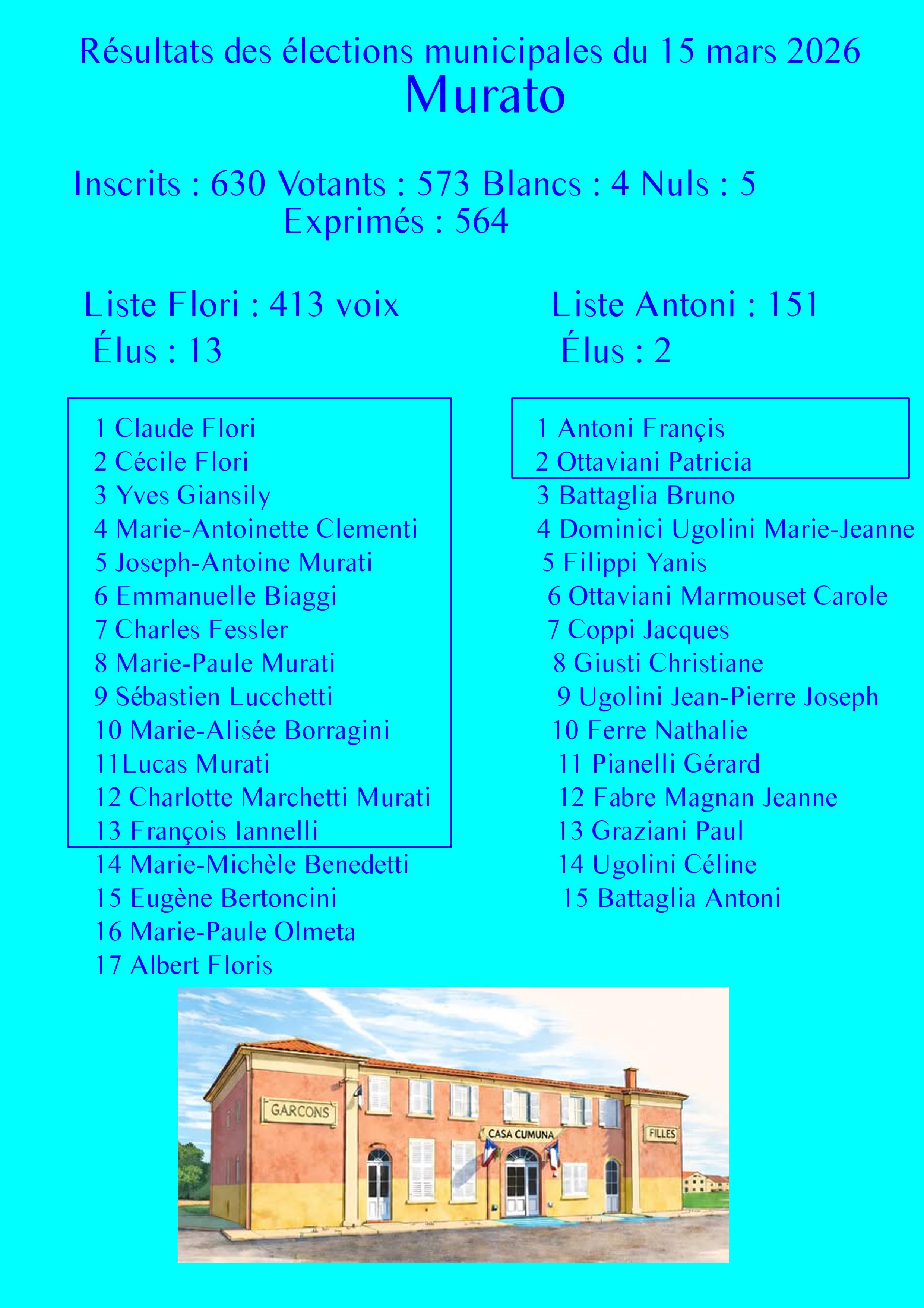 Résultats des élections municipales de Murato 15 Mars 2026 Ecrit par Pascal André Magnan le lundi 23 mars 2026 0 Partager cet article :